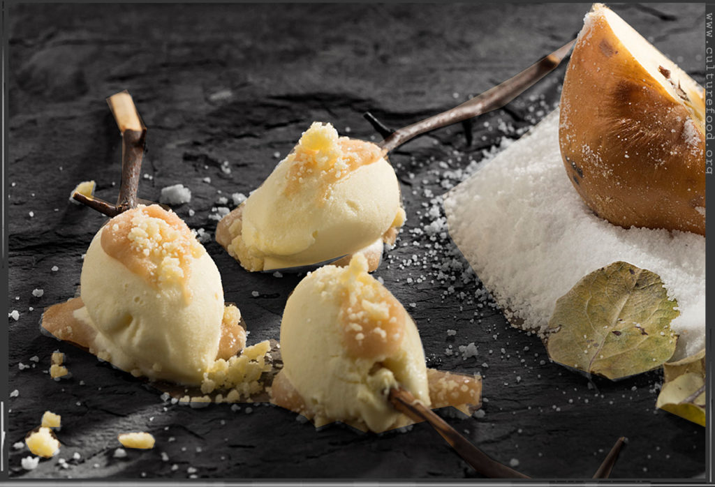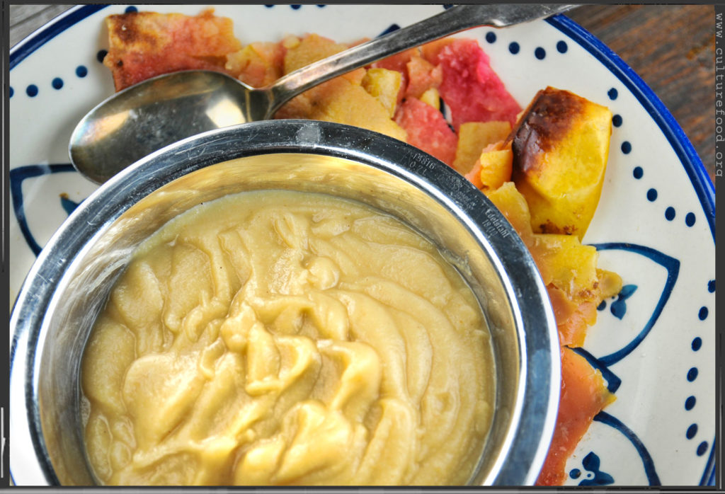 Den Apfel auf einem Teller anrichten. Einen EL Crème Double mit ein wenig Calvados und einem EL des Suds aromatisieren und aufschlagen. Zusammen mit Bauernhof-Eis oder Vanille-Parfait servieren.