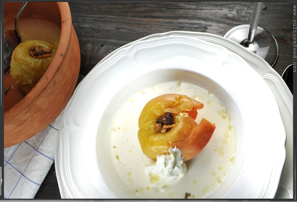 Nach dem Backen den Deckel abnehmen und die Äpfel etwas abkühlen lassen. Am Topfboden hat sich nun ein aromatischer Sud aus Fruchtsaft, Zucker und Butter gebildet. Sie sollte auf jeden Fall mit-serviert werden.