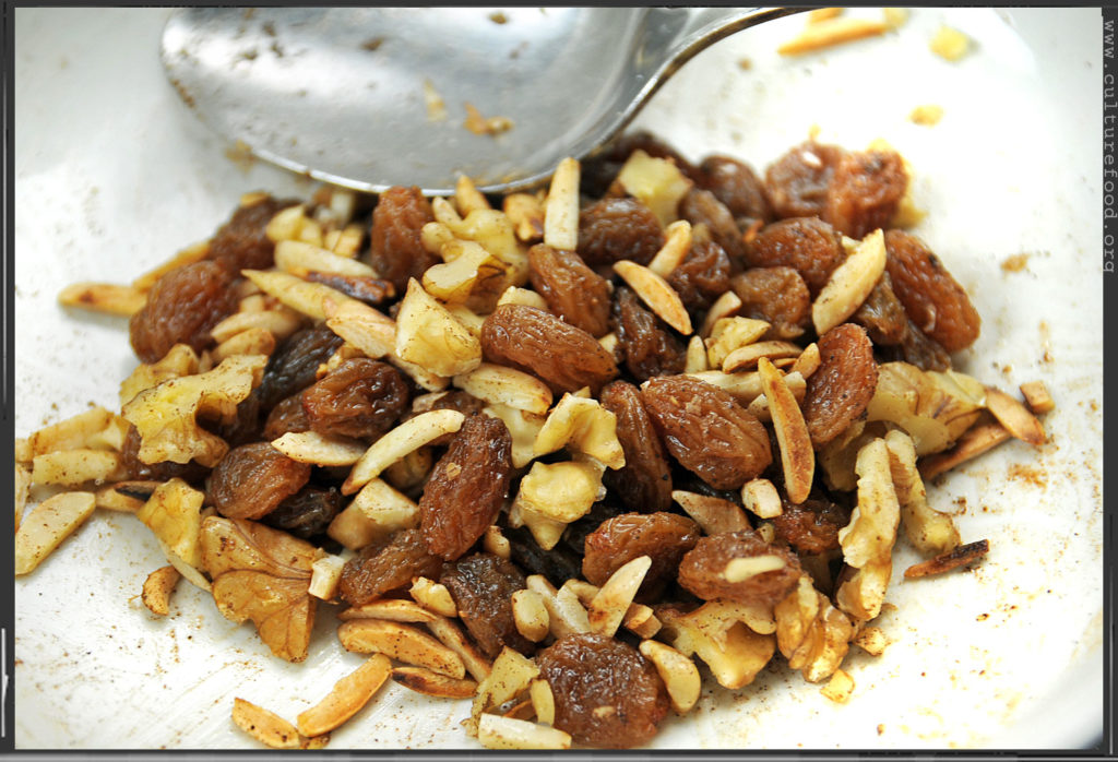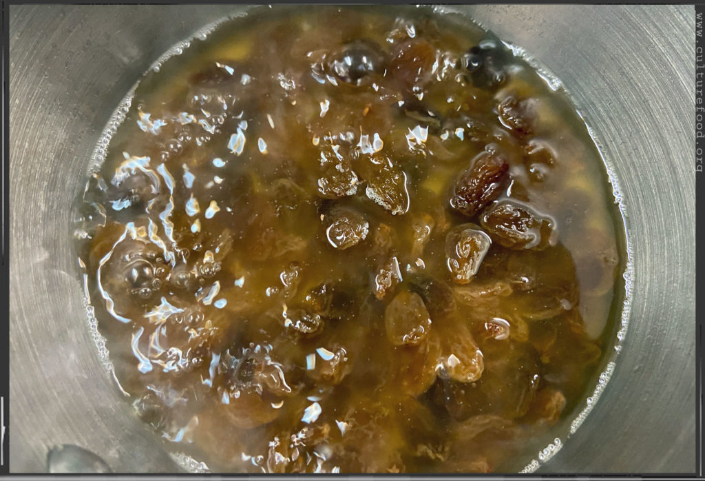 Die Sultaninen in Weißwein und mit etwas Calvados kurz aufkochen und dann solange auf kleiner Hitze weiterköcheln, bis die Flüssigkeit fast vollständig verdampft ist.