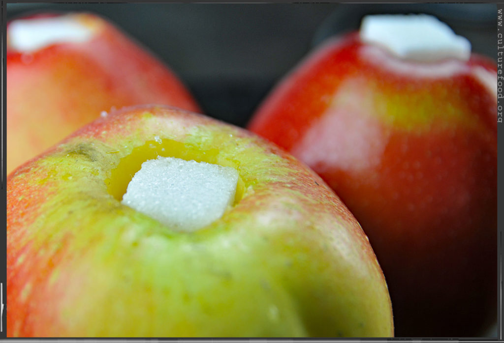Während die Sultaninen und Mandeln abkühlen, können die gewaschenen Äpfel vorbereitet werden. In diesem Fall wird kein „Deckel“ abgeschnitten, sondern die Äpfel werden nur ausgestochen. In das Bodenloch wird nun ein Stück Würfelzucker gesteckt, damit die Füllung nicht herausgleiten kann.