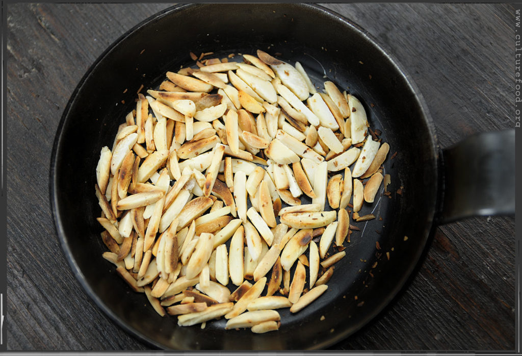 Die Mandelstifte in einer Pfanne erhitzen bis sie leicht Farbe angenommen haben. Dann sofort aus der Pfanne nehmen und in eine Schale geben.