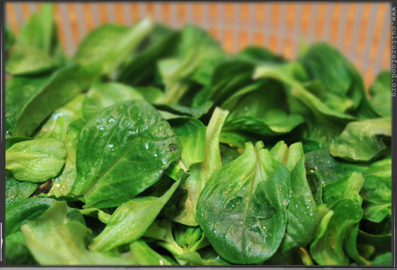 Den geputzten Feldsalat besprenkle ich mit etwas Olivenöl und verteile großzügig → Kartoffelfond darüber. Danach wird der Salat mit Stücken von der Forelle, den Apfelscheiben und etwas Schnittlauch garniert. Die lauwarmen Croutons und Speckwürfel oben drauf, etwas Fleur de Sel und Pfeffer, zwei Gläser Auxerrois dazu… fertig. Das Wochenende kann kommen.