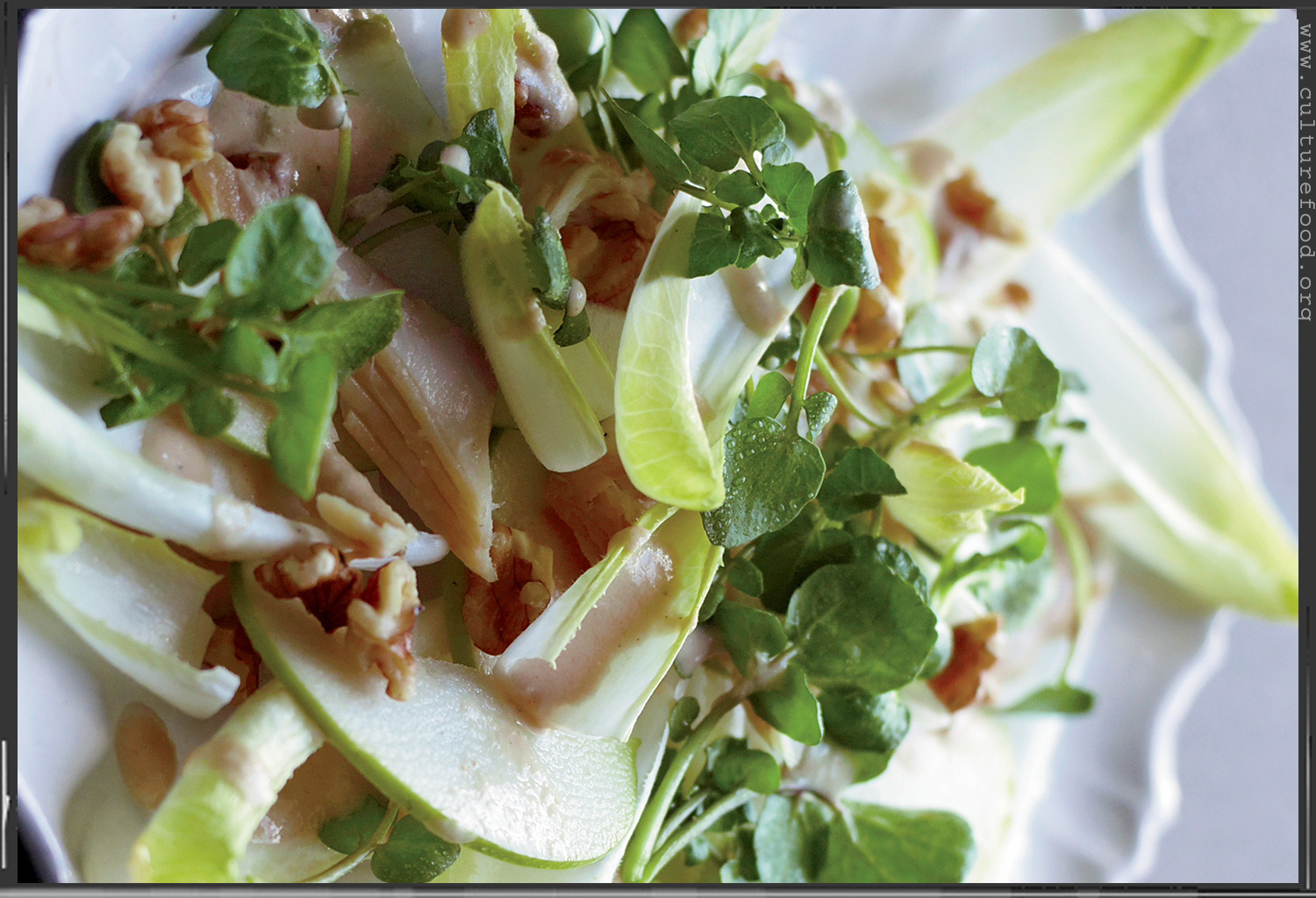 Ein kalter und schneereicher Freitagabend im Februar. Madame und ich sind von einer arbeitsreichen Woche erschöpft und haben weder Lust noch die nötige Energie, um ein kompliziertes Abendessen zu kochen. Von einem Forellenzüchter im Nachbarort besorgen wir zwei frisch geräucherte Forellen, der Gemüseladen hat noch frischen Feldsalat. In der Küche sind noch Zwiebeln, Äpfel und Weißbrot vorrätig – das sollte genügen.