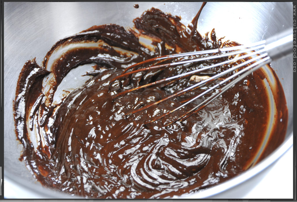 Schritt 1: Die Schokolade abwiegen und zusammen mit der Butter im Wasserbad schmelzen. Währenddessen geht es mit Schritt 2 und 3 weiter. Die geschmolzene Schokoladencrème glatt rühren.