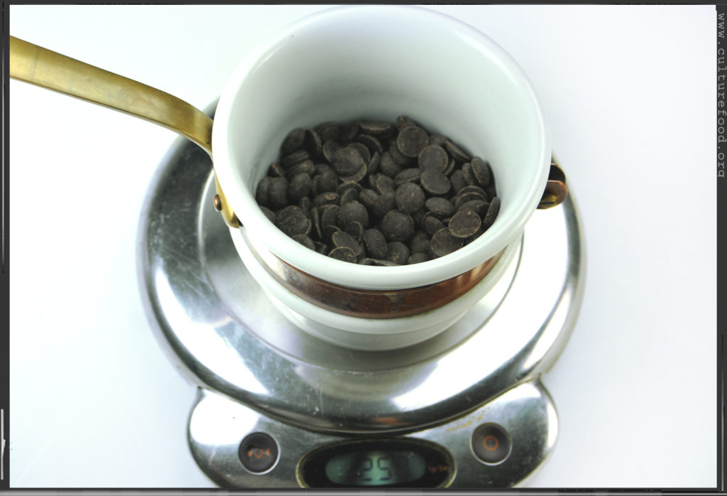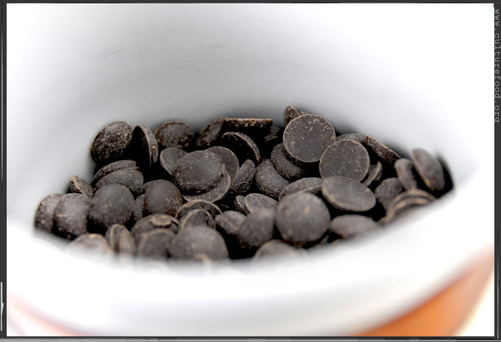 - 250 g Schokolade (mind. 65% Kakaoanteil oder Couverture). Ideal sind kleine Schokodrops (Callets), wie sie von Callebaut oder Valrhona angeboten werden weil diese schneller schmelzen als Blockschokolade
