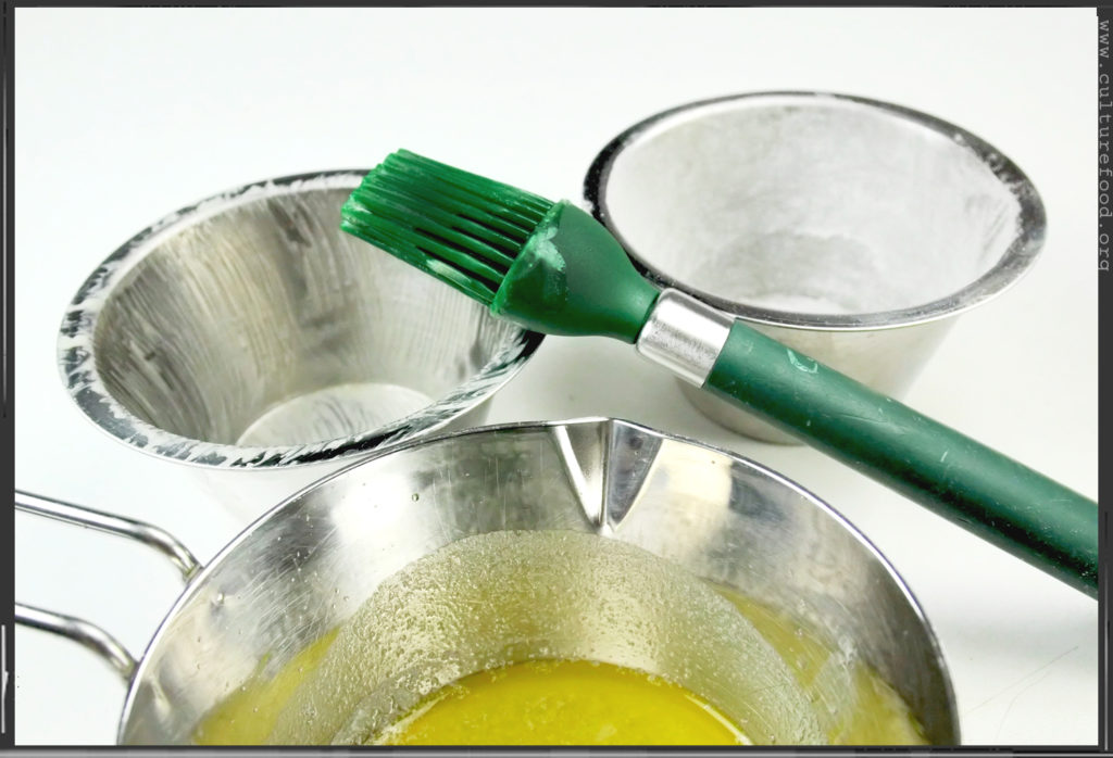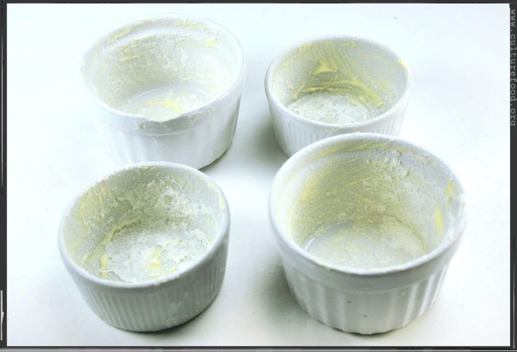 Schritt 2: Während die Schokolade langsam schmilzt, 4 kleine Soufflé-Förmchen mit Butter ausfetten und mit etwas Mehl bestäuben. Einen besonders glatten Kuchenrand erhält man, wenn man flüssige Butter mit dem Pinsel aufträgt und fein mehliert.