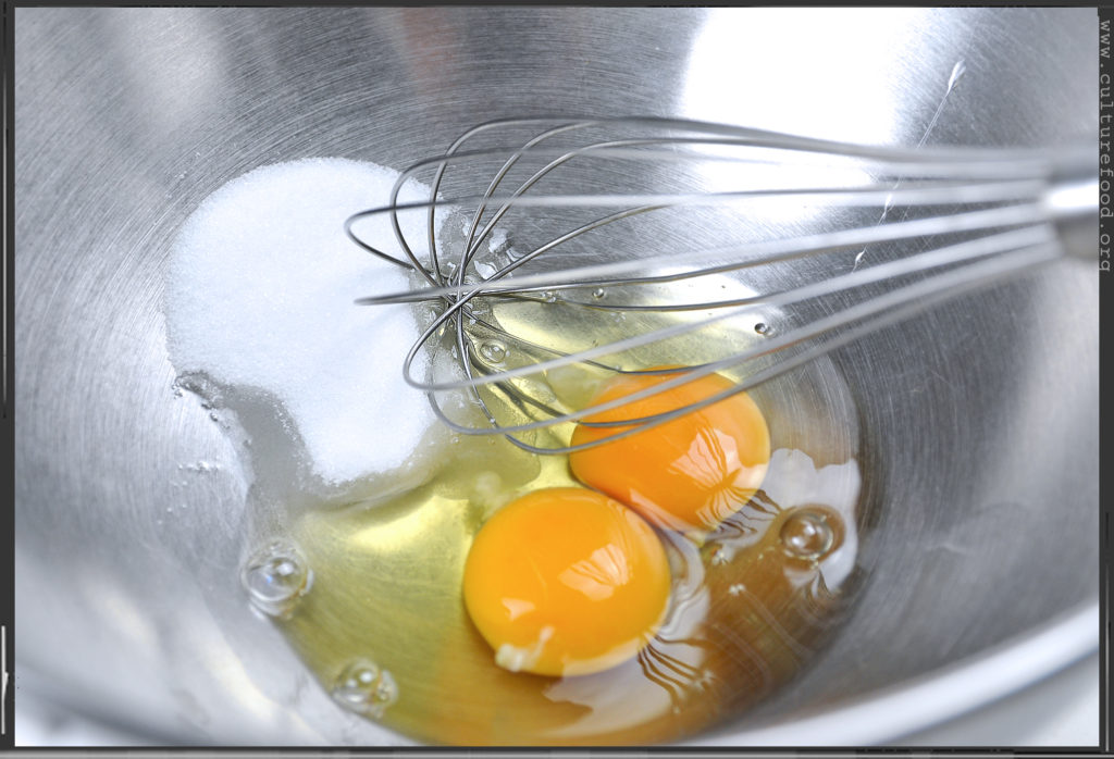 In einer Schüssel die Eier mit dem Zucker gut vermengen und schaumig rühren. 1 EL Mehl dazugeben und nochmals kräftig aufschlagen. Wenn man höhere Törtchen haben möchte, die fluffig im Ofen aufgehen, kann man an dieser Stelle ein Päckchen Backpulver hinzufügen; persönlich verzichte ich allerdings darauf, da ohne Backpulver der Kern flüssiger bleibt…