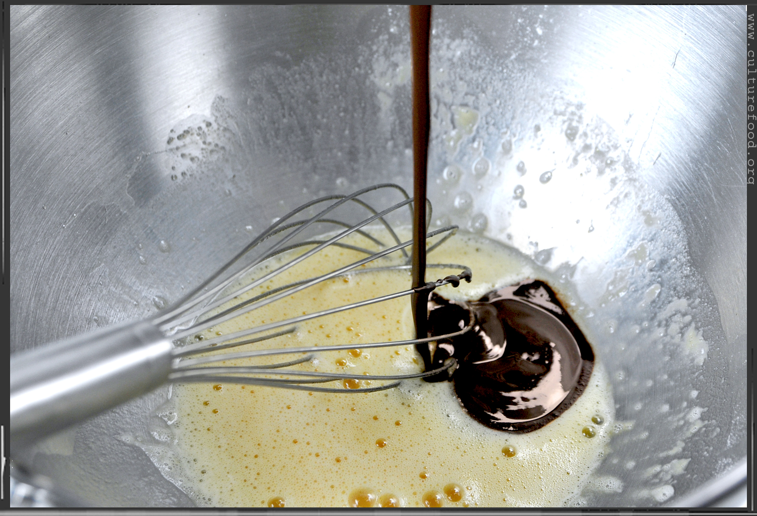 Sobald die Schokoladenmasse geschmolzen ist, diese nun im dünnen Strahl und unter kräftigem Rühren unter die Eimasse heben.