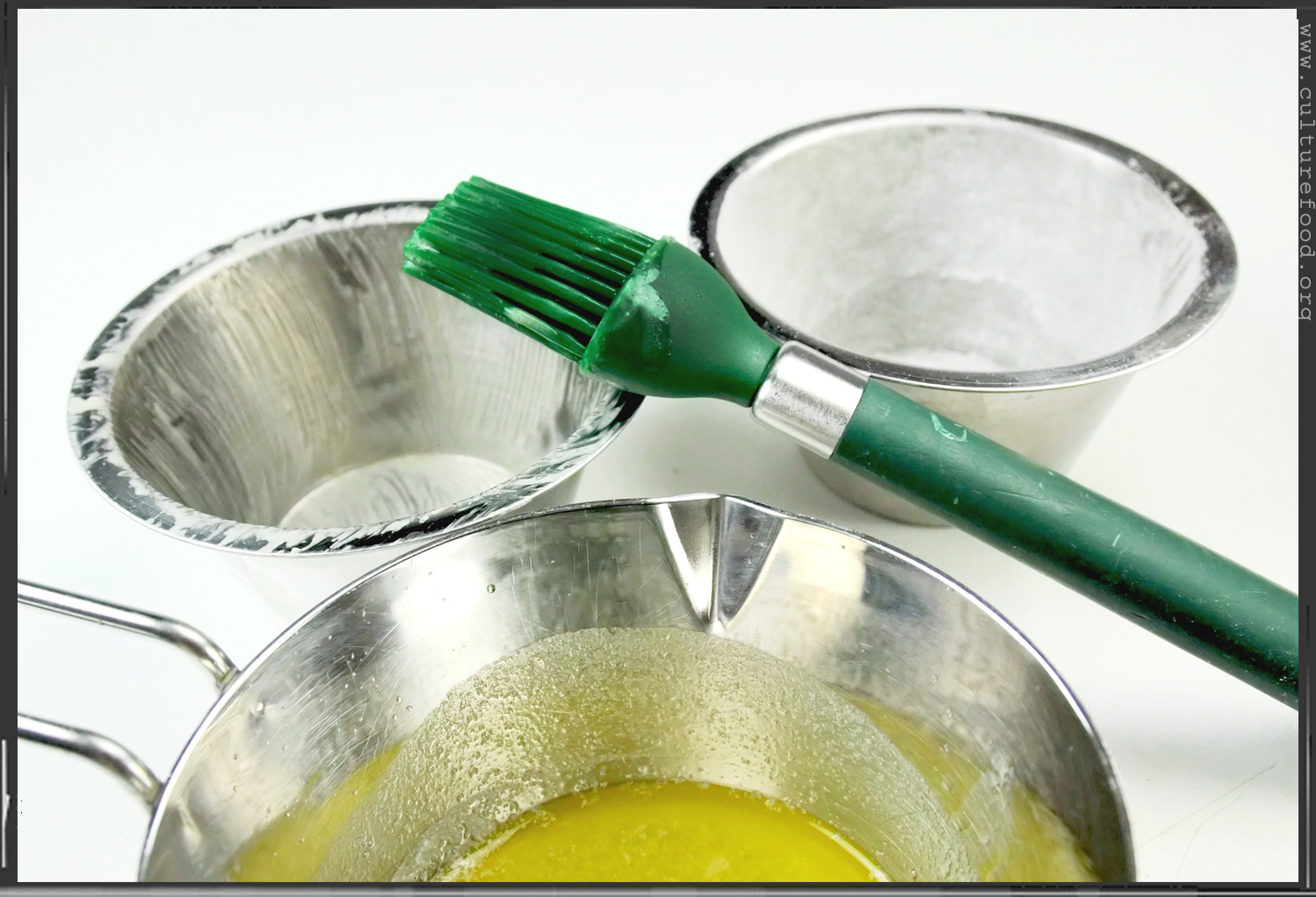 Schritt 2: Während die Schokolade langsam schmilzt, 4 kleine Soufflé-Förmchen mit Butter ausfetten und mit etwas Mehl bestäuben. Einen besonders glatten Kuchenrand erhält man, wenn man flüssige Butter mit dem Pinsel aufträgt und fein mehliert.