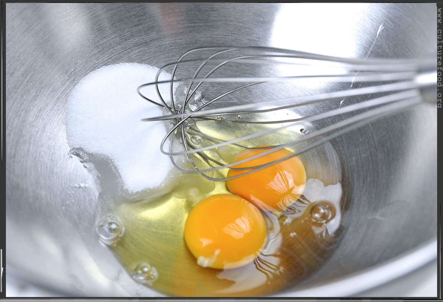 In einer Schüssel die Eier mit dem Zucker gut vermengen und schaumig rühren. 1 EL Mehl dazugeben und nochmals kräftig aufschlagen. Wenn man höhere Törtchen haben möchte, die fluffig im Ofen aufgehen, kann man an dieser Stelle ein Päckchen Backpulver hinzufügen; persönlich verzichte ich allerdings darauf, da ohne Backpulver der Kern flüssiger bleibt…