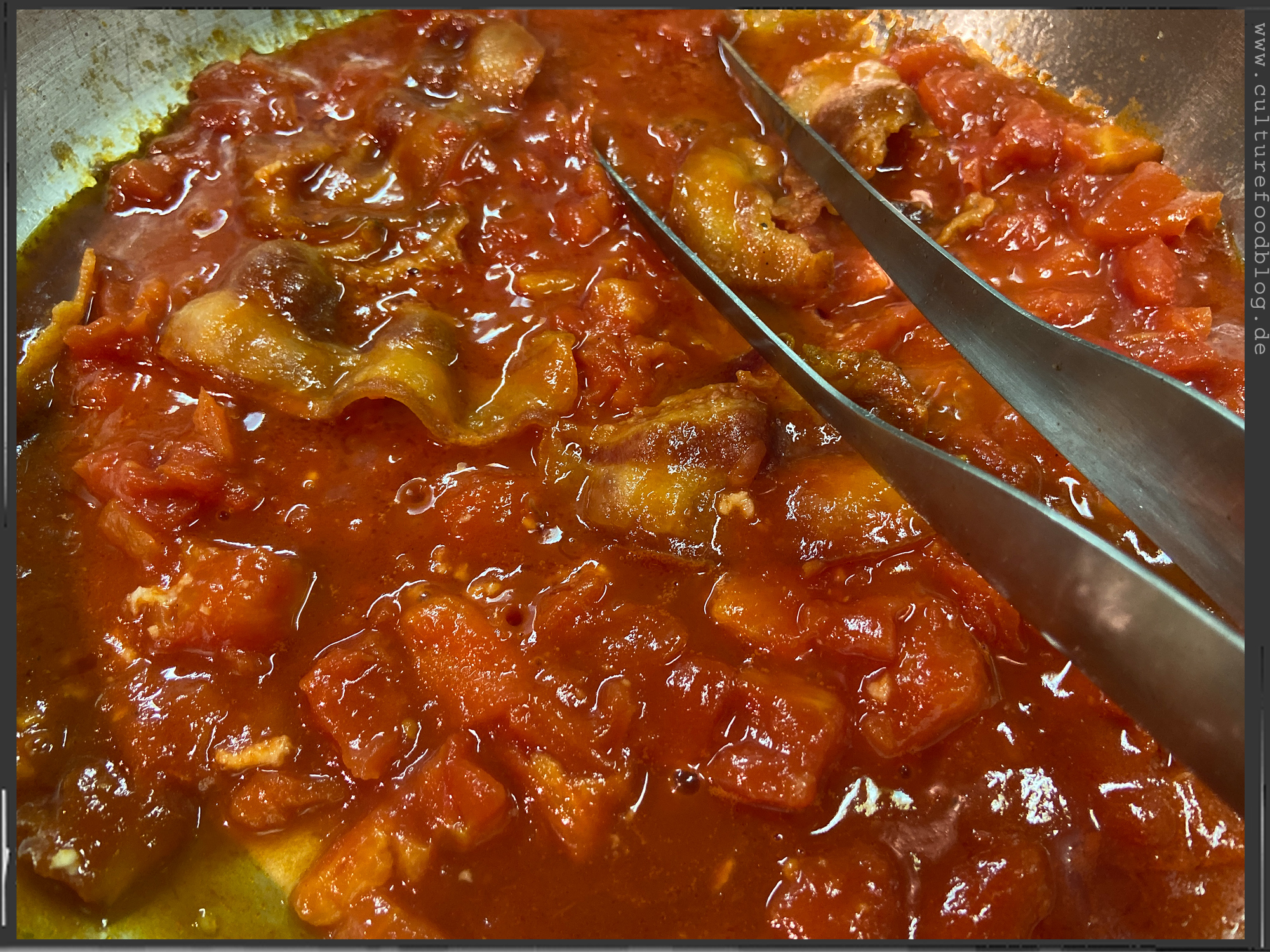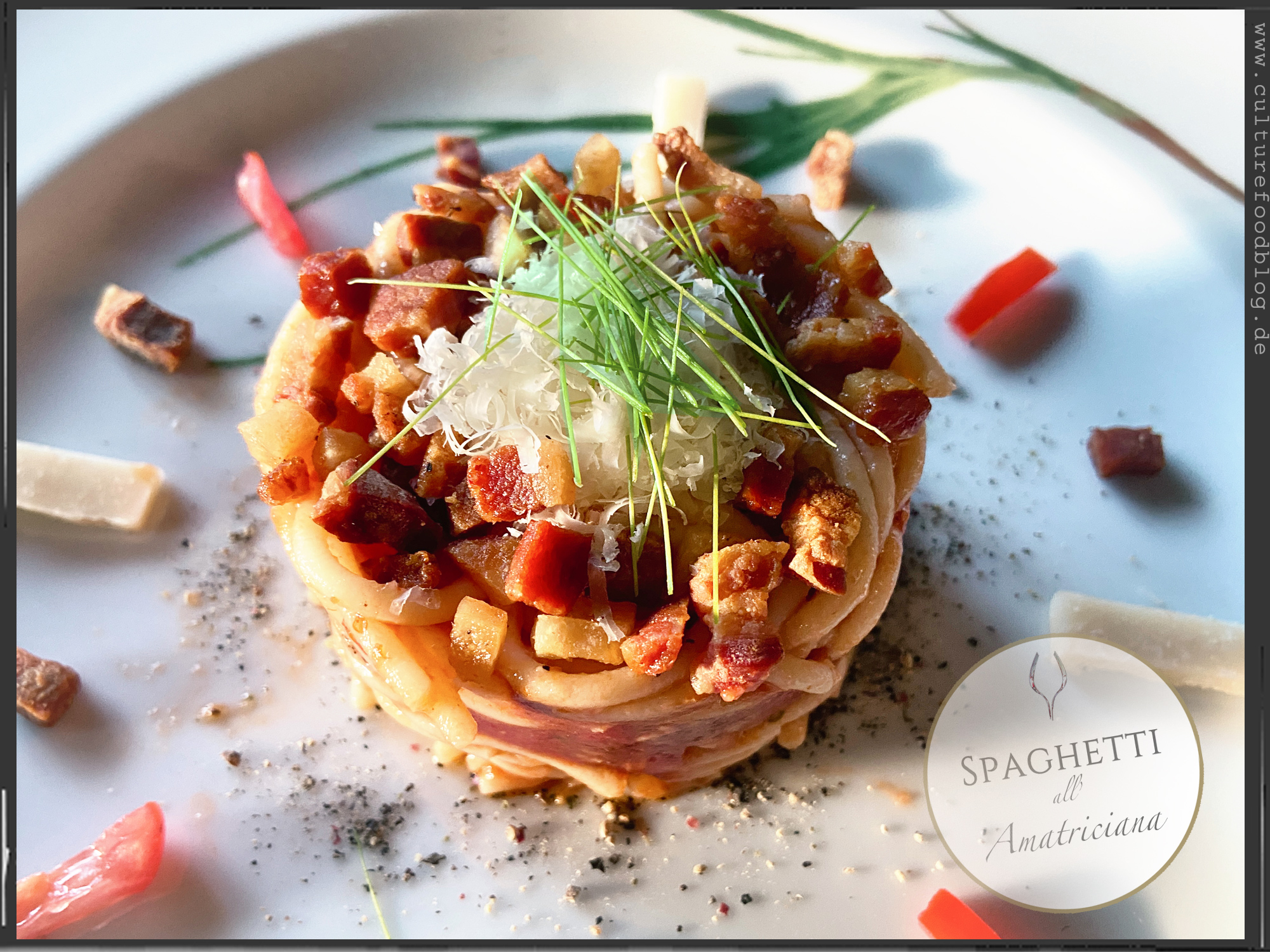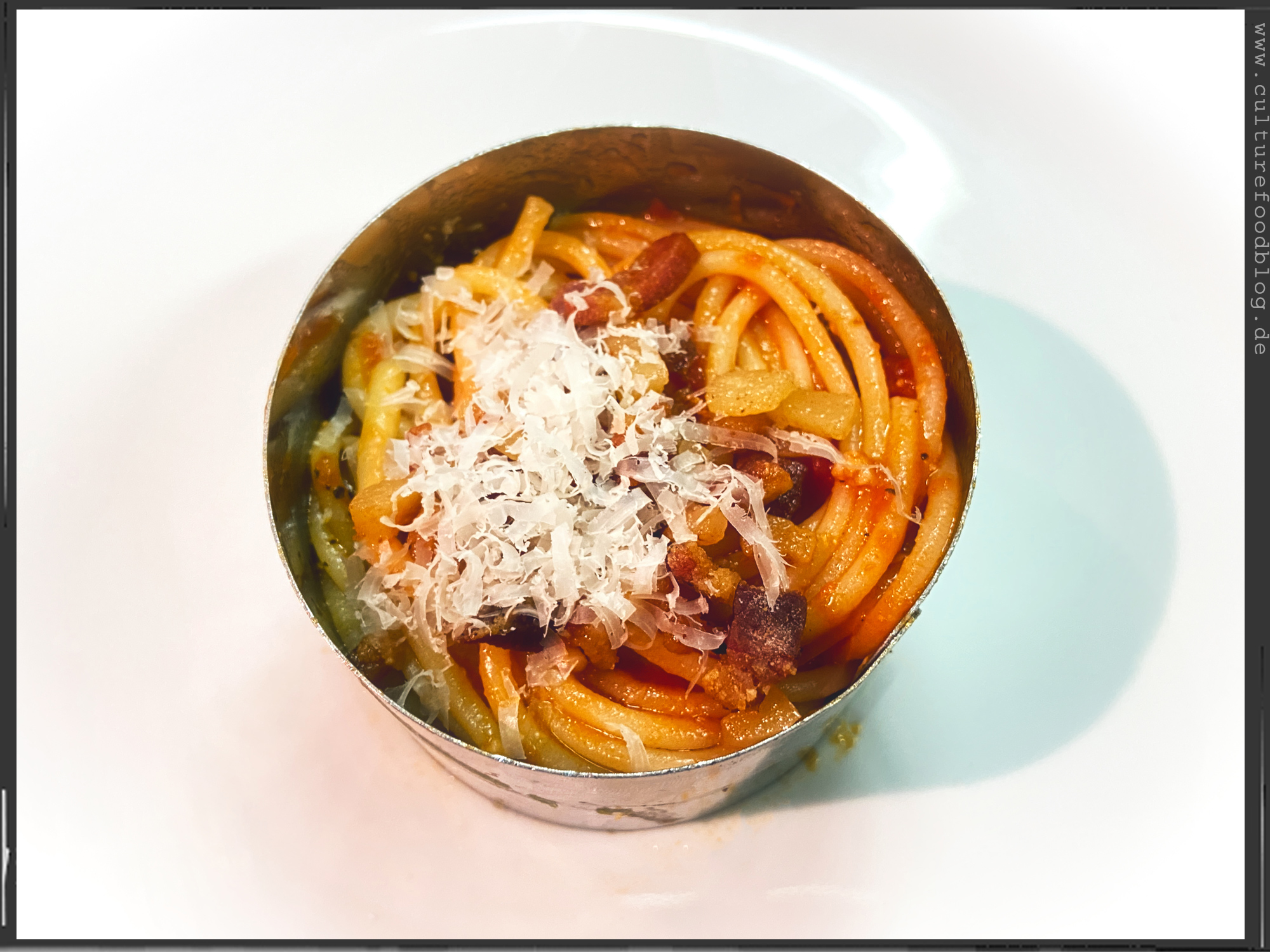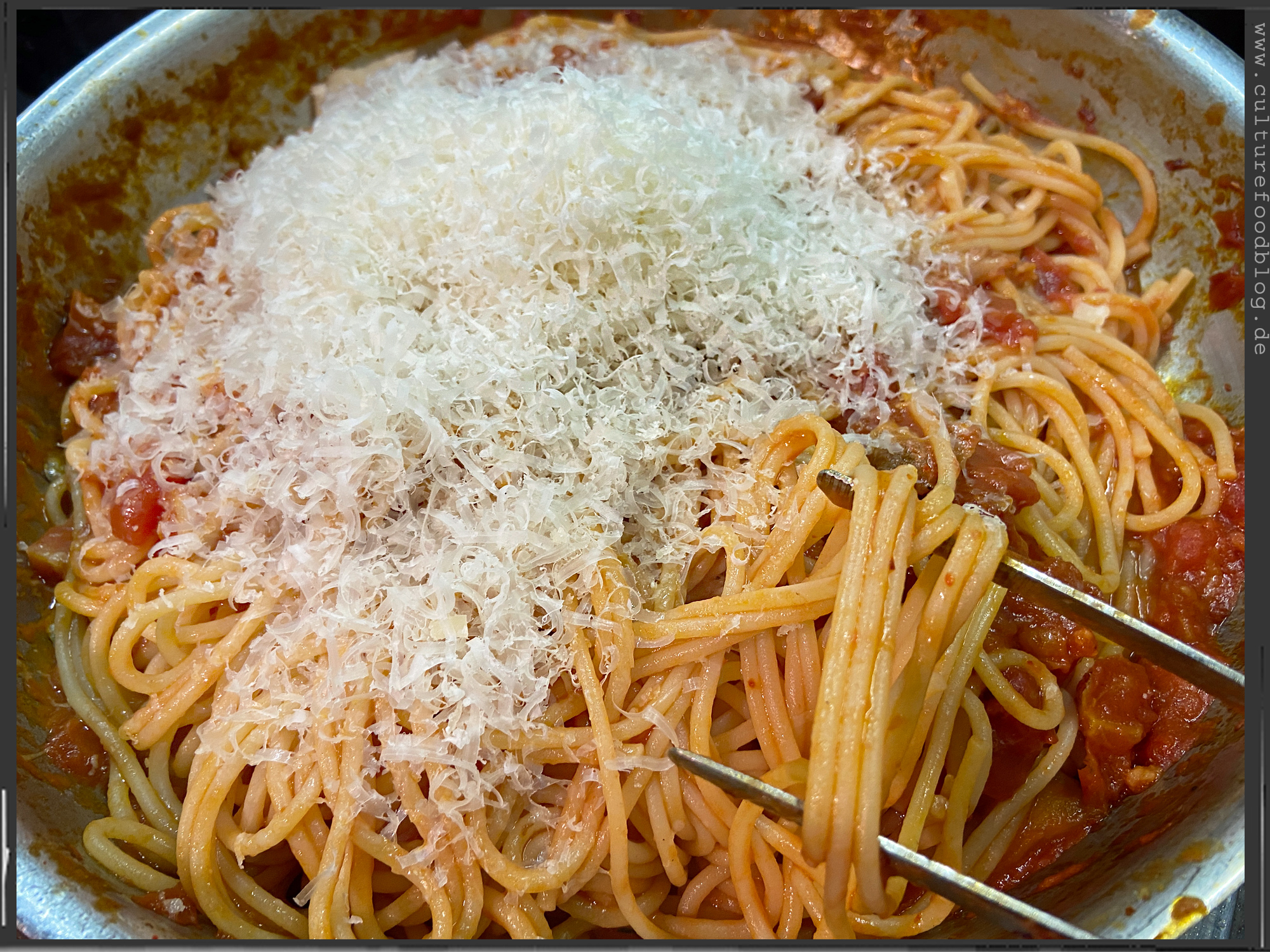 Spaghetti  |  Guanciale  |  Tomatenwürfel (Polpa Pezzi)  |  Tomatensoße (Passata)  |  Pecorino
